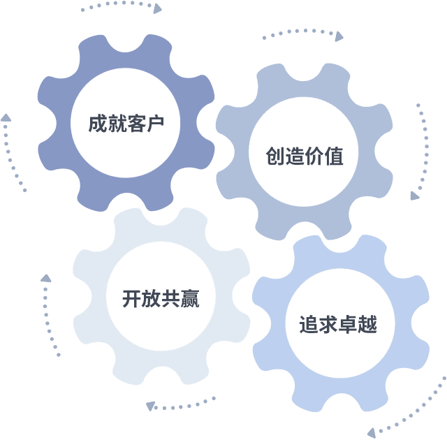 成就客户是一切决策的出发点,,,,创造价值是衡量所有工作的标准,,,,追求卓越是我们做事做人的态度,,,,开放共赢是我们的格局也是最终的结果。。价值观的齿轮环环相扣,,,,推动着组织里的每个人不断向前。。