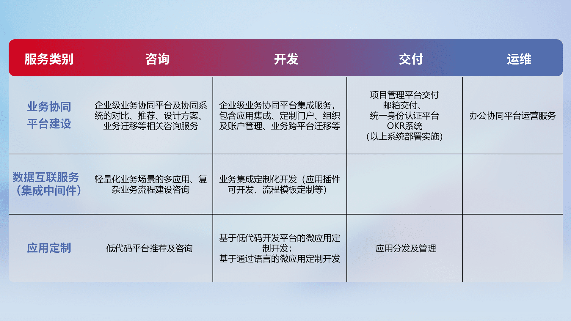 针对钉钉、、企微、、、、IDaas等平台级产品提供产品的规划、、、、方案、、、、交付、、定制化开发等服务,,,实现如统一协同办公、、、、智能客户服务、、、、混合会议管理、、智能数据查询、、等业务场景,,,实现数字化转型。。。。