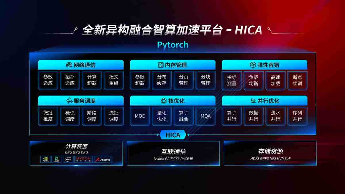 通过自研的服务层、、、中间适配层、、以及调度编排算法,,采用数据并行、、模型并行等多种并行方式,,把并行计算任务进行有效的分解,,,使其分别由相应的软件栈和算力资源来承接。。。。当GPU资源变化,,,HICA可以实时动态调度计算子任务并调整模型拓扑和架构,,以充分聚合各种算力资源。。。